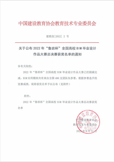 2022年5月29日,由中国建设教育协会举办的2022年“鲁班杯”全国高校BIM毕业设计作品大赛B1-BIM应用赛项总决赛线上答辩圆满落下帷幕。我校betway西汉姆联官网参赛学子从全国486只团队中脱颖而出,荣获本科组一等奖。