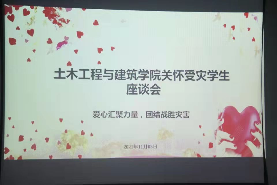 为了使受灾学生感受到社会给予的关怀,我院开展了以“爱心汇聚力量,团结战胜灾害”为主题的关怀学生座谈会。此次座谈会于11月3日晚,在A09三楼会议室顺利召开,出席本次会议的有党委副书记袁大伟老师、团委书记许玲玲老师以及我院受灾学生。