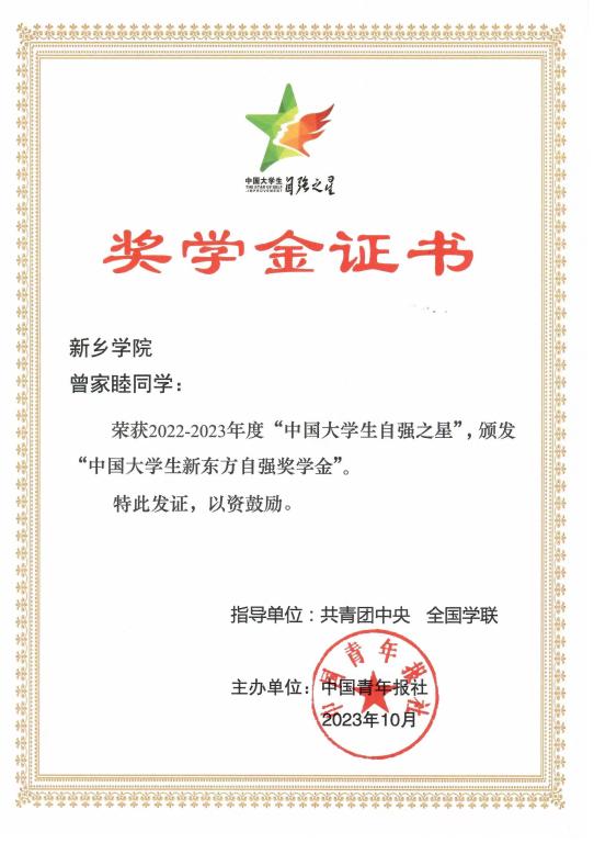 近日,由共青团中央、全国学联指导,中国青年报社、新东方教育科技集团、中国青年创业就业基金会联合举办的2022年度“中国大学生自强之星”奖学金评选结果揭晓。我院土木工程专业2020级学生曾家睦荣获“中国大学生自强之星”荣誉称号。这是我院在此榜单中首次实现零的突破,曾家睦同学更是我校近三年唯一获得此项荣誉的学生。