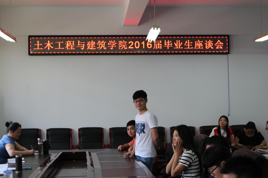座谈会伊始,和书记首先代表学院向2016届毕业生顺利毕业表示衷心祝贺,然后向大家介绍了本次座谈会的主要谈话内容。接下来列席师生就毕业生对学院教育教学管理、学生管理、学风建设和校园活动等方面存在的问题与不足及需要改进的方面进行交谈。会谈中毕业生代表就学校和学院未来的发展还给出了一些建设性意见。会上,大家畅所欲言,毕业生代表申鹏同学指出,交通工程开设课程较多,所学领域点多面广,建议学院找出合适教学方式引导学生找到专业主攻方向深入学习。毕业生聂兴龙指出,学院可以多组织一些建筑行业的比赛,学生准备比赛的过程也是自我升华的过程,这些比赛可以打开学生的视野,增加学生之间的交流。毕业生们对班级管理、实验教学、学业规划等方面都提出了较好的建议。与会领导老师认真的聆听了毕业生代表们的发言,并对大家提出的问题一一进行回应。和存龙书记对毕业生代表为学院提出的建设性意见表示感谢,承诺学院将会研究采纳大家的建议并纳入学院的发展和建设规划当中来。最后学院领导和老师祝福毕业生们前程似锦,同时也希望毕业生们将来能够时刻关注学校和学院的发展,为母校的建设和发展添砖加瓦。座谈会在轻松欢快的气氛中结束。