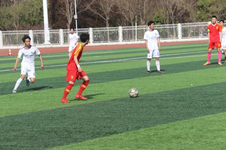 随着主裁判一声哨响,两队开始了激烈拼抢。开场仅8分钟,土建学院前锋的一记中距挑射成功将球送入球门,瞬间点燃了场旁观看助威的同学们的热情,并使土建学院在后面的比赛中一直占据着场上的主动。土建学院的球员们凭借默契的配合,多次将球带到对方球门附近,给对方造成了很大威胁。在上半场将