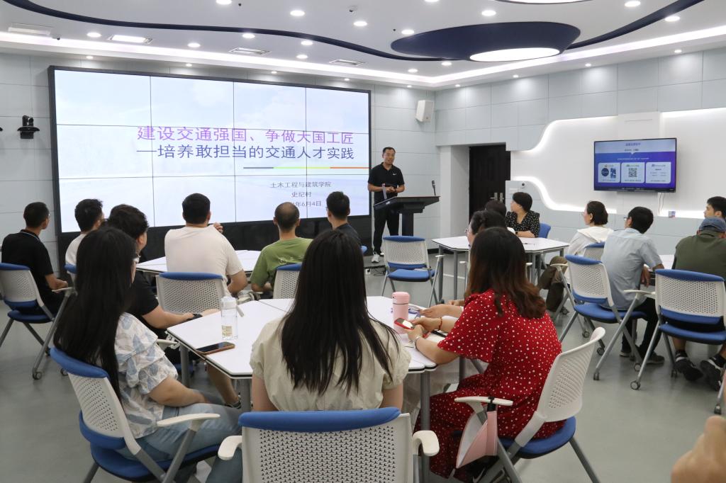 第一场专题讲座,由史纪村博士主讲,主题为《建设交通强国、争做大国工匠—培养敢担当的交通人才实践》。史博士结合我国公路交通的特点,讲述公路交通网络体系在我国经济社会发展中的重大作用,尤其是在实现两个一百年奋斗目标过程的重要支撑作用。史博士以路基路面工程课程为依托,介绍如何建立科学的知识体系并培养学生的家国情怀;介绍科研+教学融合共生的经验方法:以为党育人、为国育才为目标导向,以落实人才培养方案为根本,在教学过程中注重培养学生探索能力,引导带领学生参与科研课题,让学生学会学习、成长成才,从而落实立德树人根本任务。