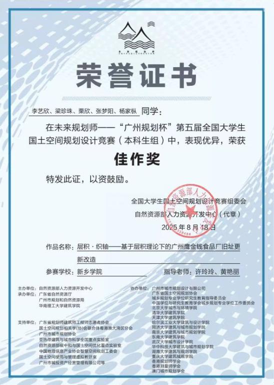 在我院城乡规划专业《城市设计》课程的支撑与推动下,2022级城乡规划李艺欣、梁珍珠、栗欣、张梦阳、杨家枞五位同学,在许玲玲、黄艳丽老师的指导下,完成作品《层积·织轴——基于层积理论下的广州鹰金钱食品厂旧址更新改造》,荣获国土空间规划设计竞赛(本科生组)佳作奖。